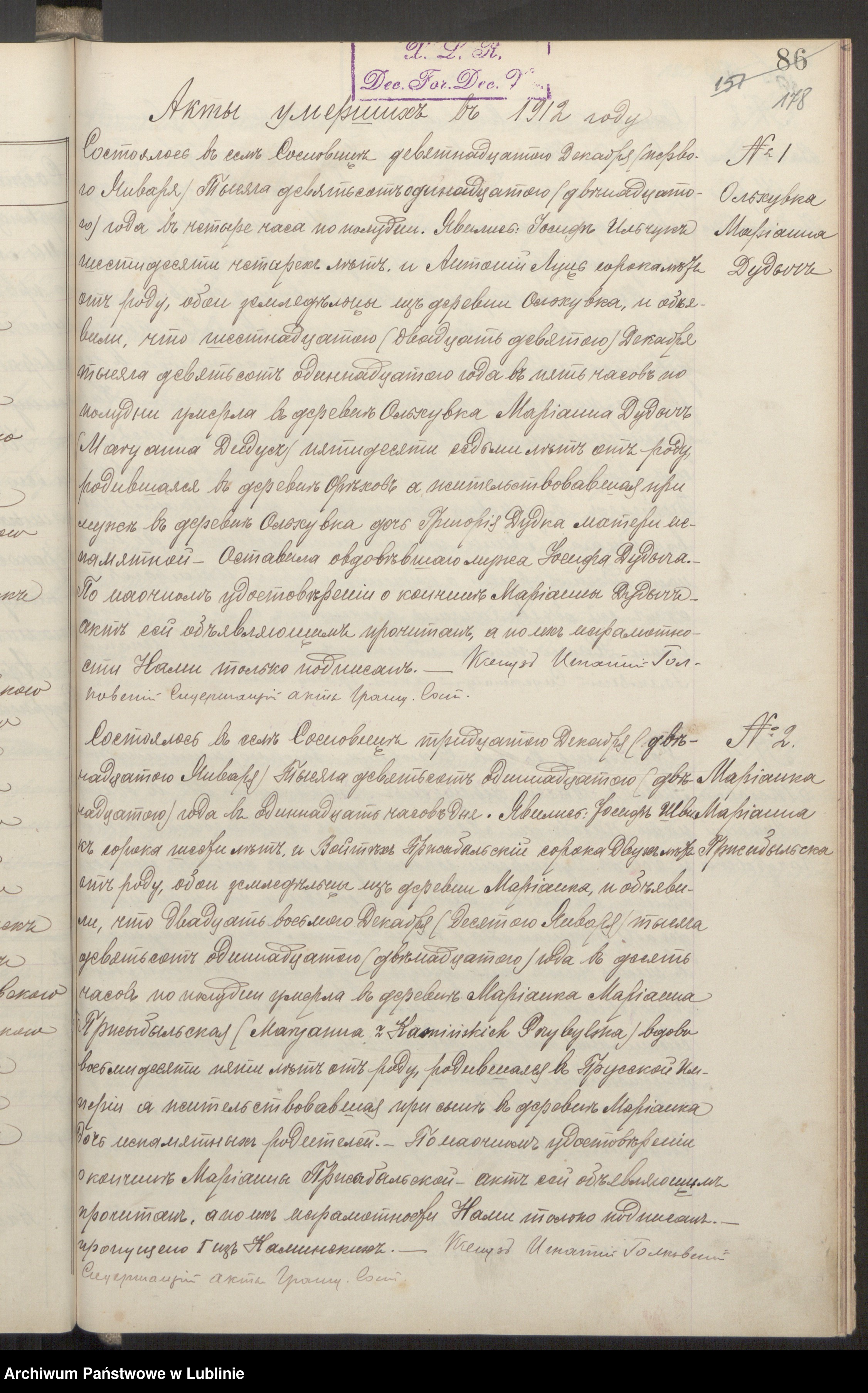 Marianna Przybylska z domu Kamińska umiera w 1912 roku. Tu jako miejsce urodzenia podano Prusy. Akt zgonu nr 2: